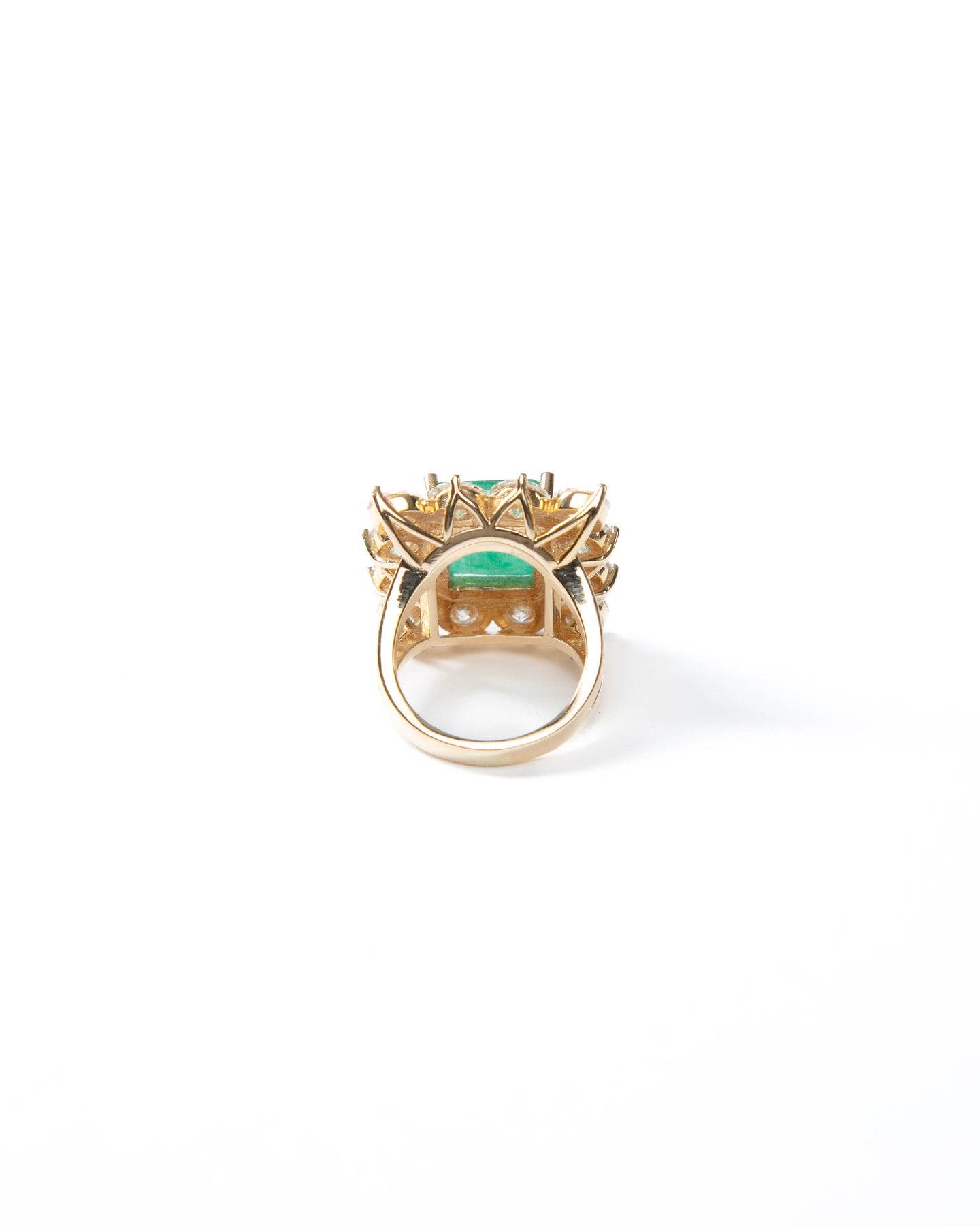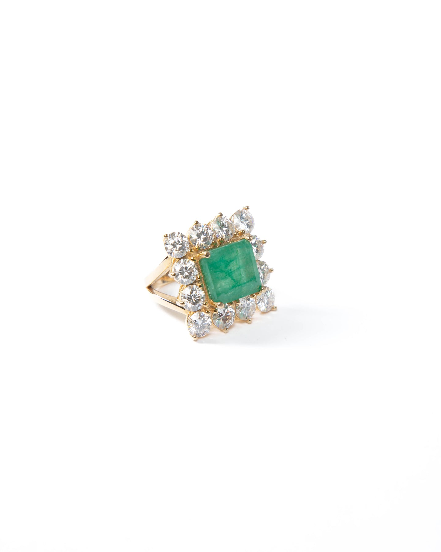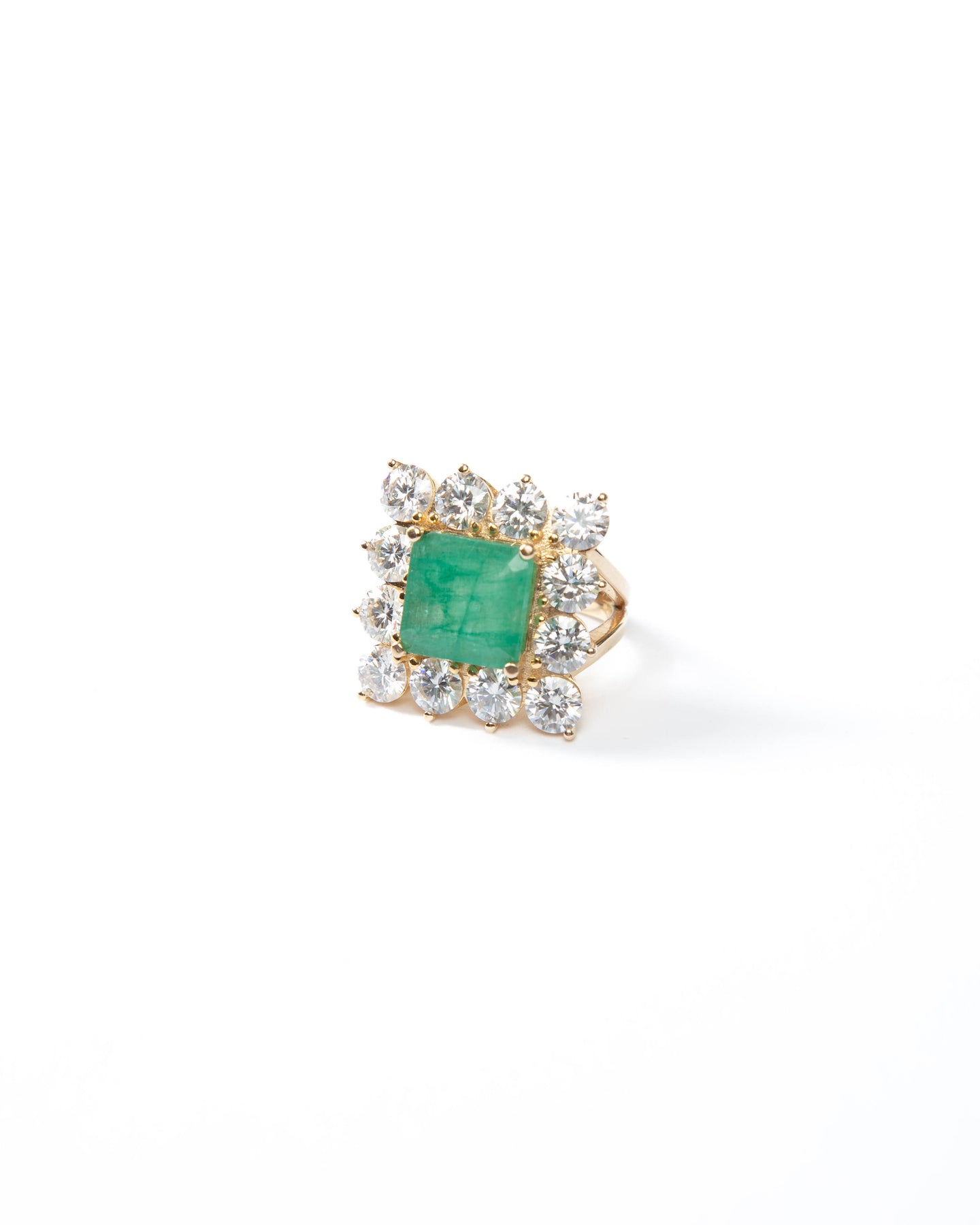 This oversized ring can be customized to your liking and budget. Cast in 10k, 14k or 18k this ring makes a statement. The outside stones are round .25ct and can be either lab diamonds or diamonds. The stone in the picture is a Colombian Emerald but you can pick from: Colombian, Brazilian, Zambian or Afghanistan. The carat size 6 but depending on the cut it can be between 5.5 to 6.7ct.