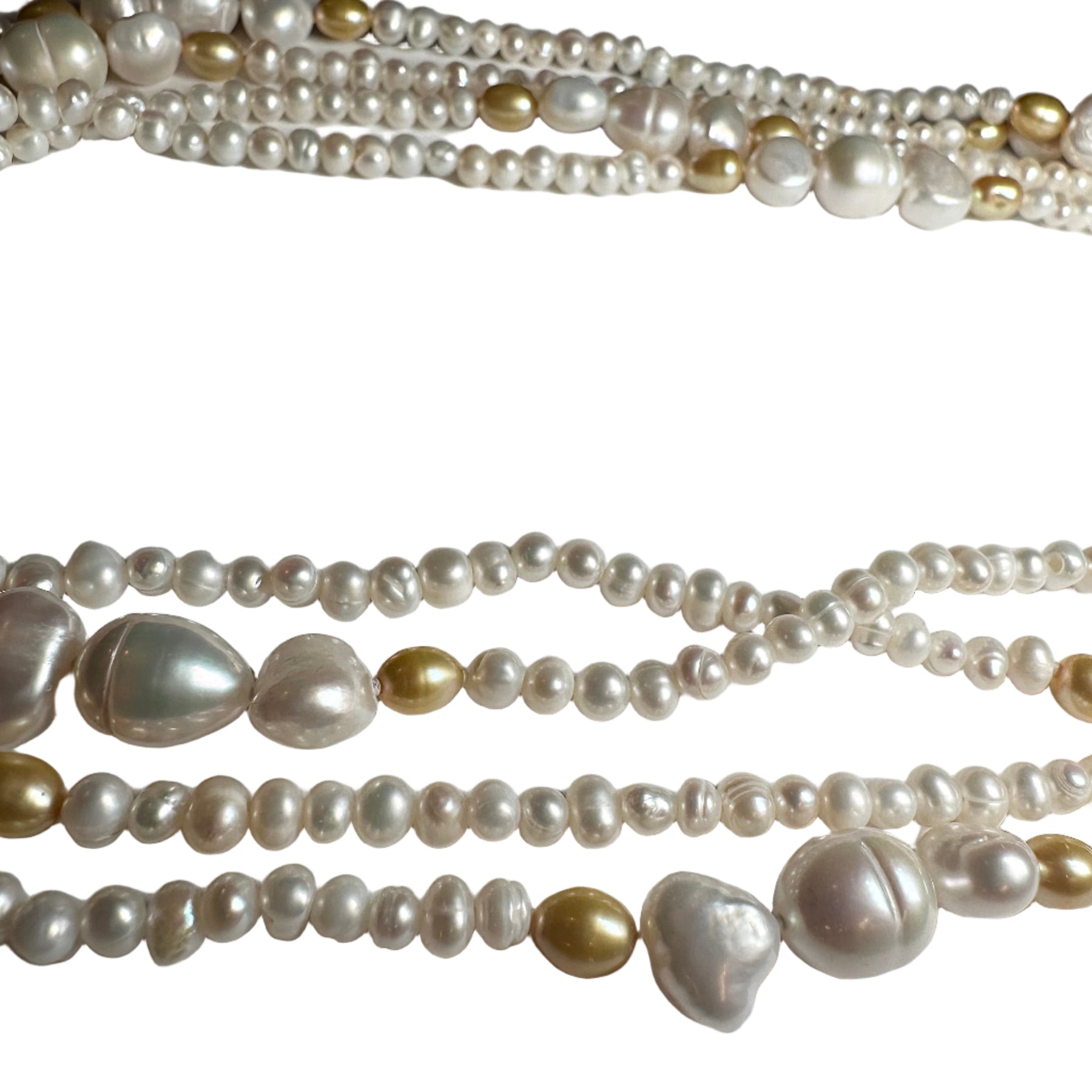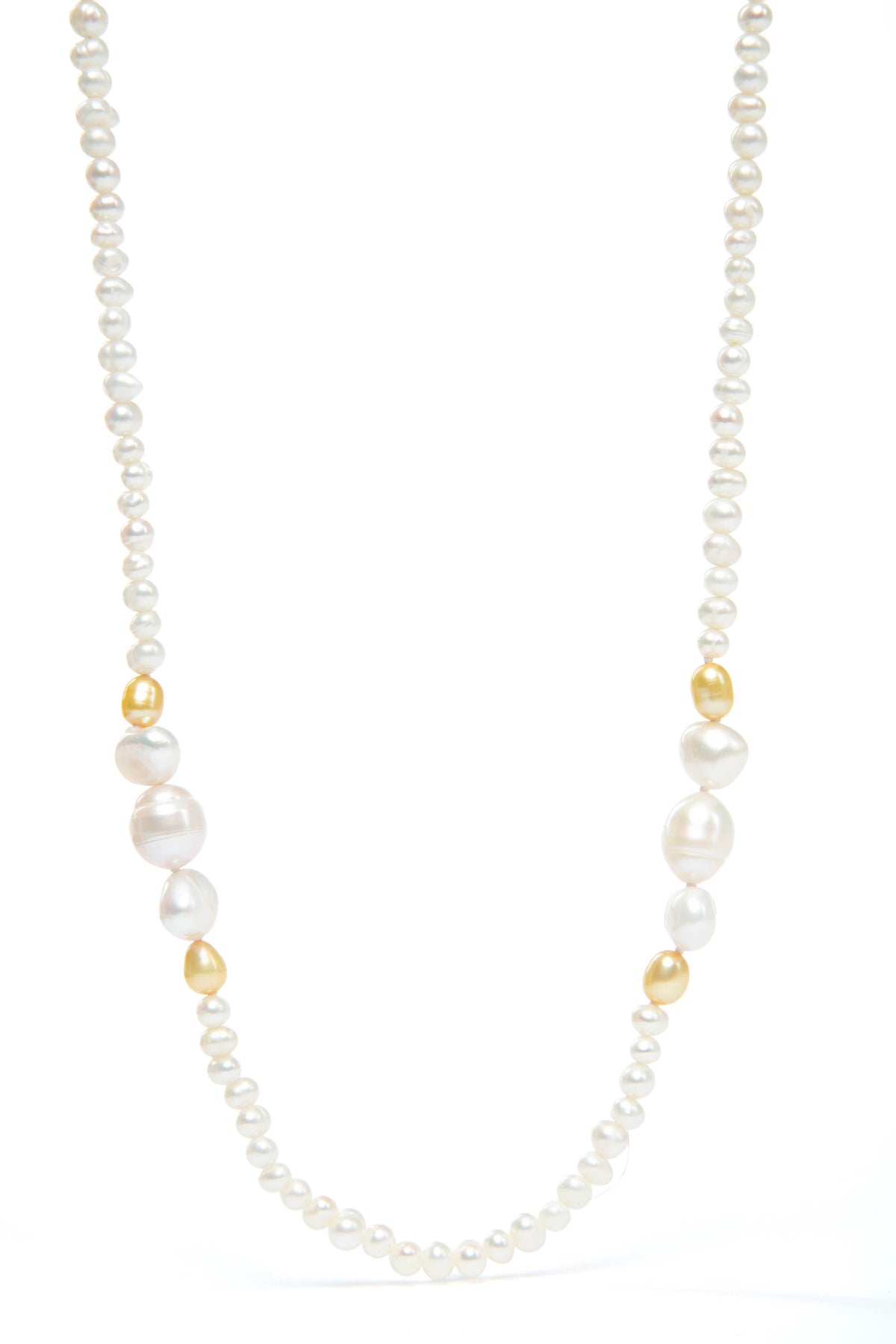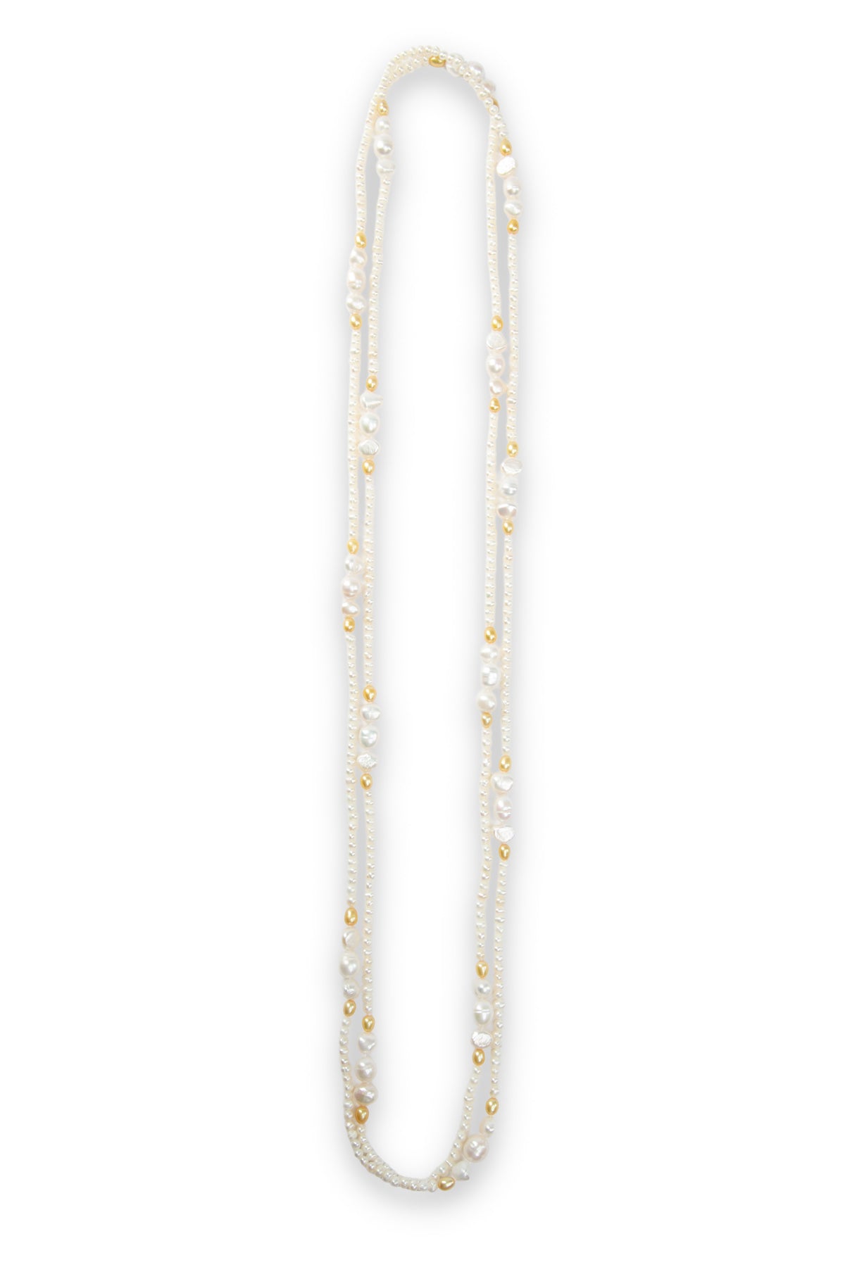 The must-have pearl silhouette dominating the runways in London, Paris, Milan, and New York. These natural freshwater pearls are made up of luminous white pearls and dyed gold pearls, creating a rich, glossy finish that brings instant glamour to any look. The pearls are knotted, highlighting the craftsmanship and artistry behind the design.