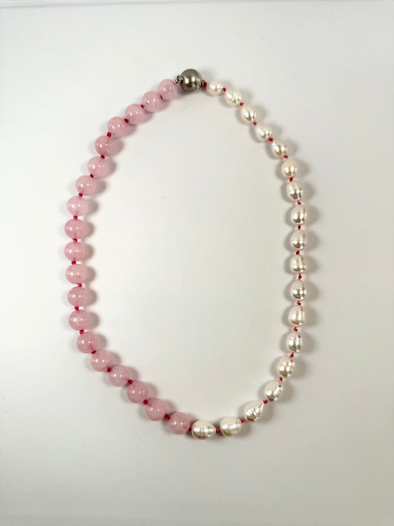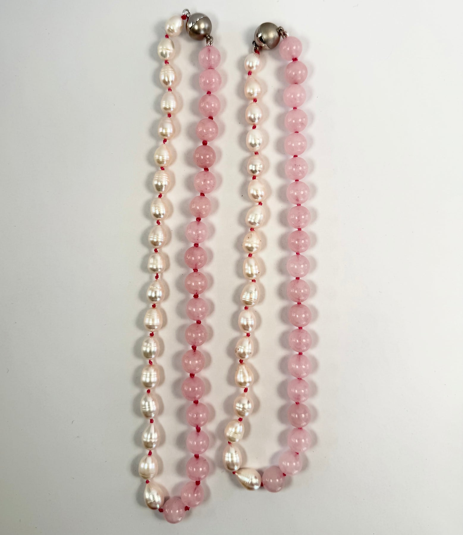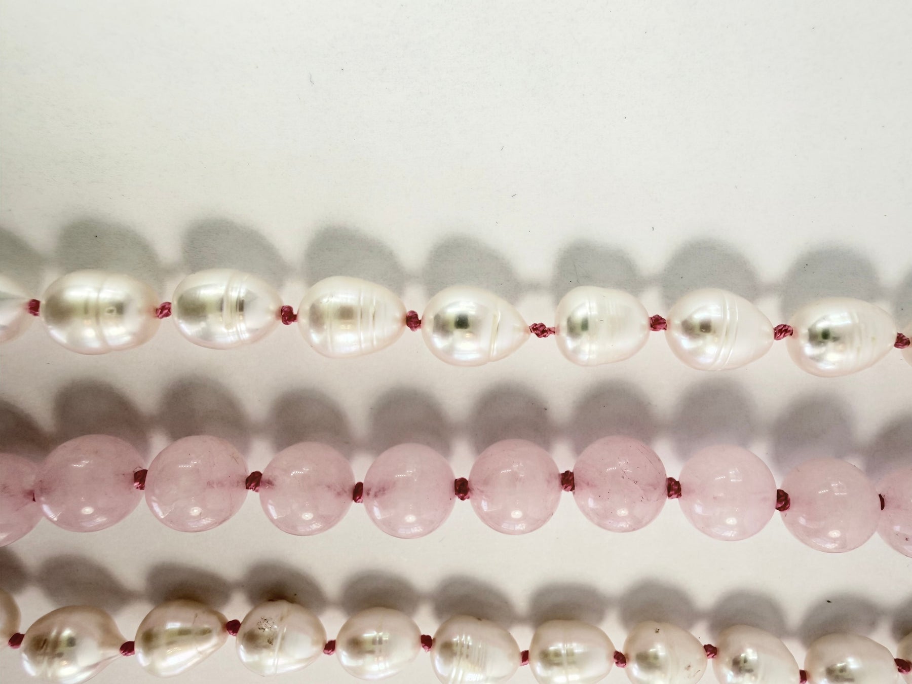 A fresh take on the classic pearl strand, this design balances luminous pearls with soft rose quartz for a look that feels modern and refined. Each bead is double-knotted on pink silk cord using traditional techniques for beauty and durability.