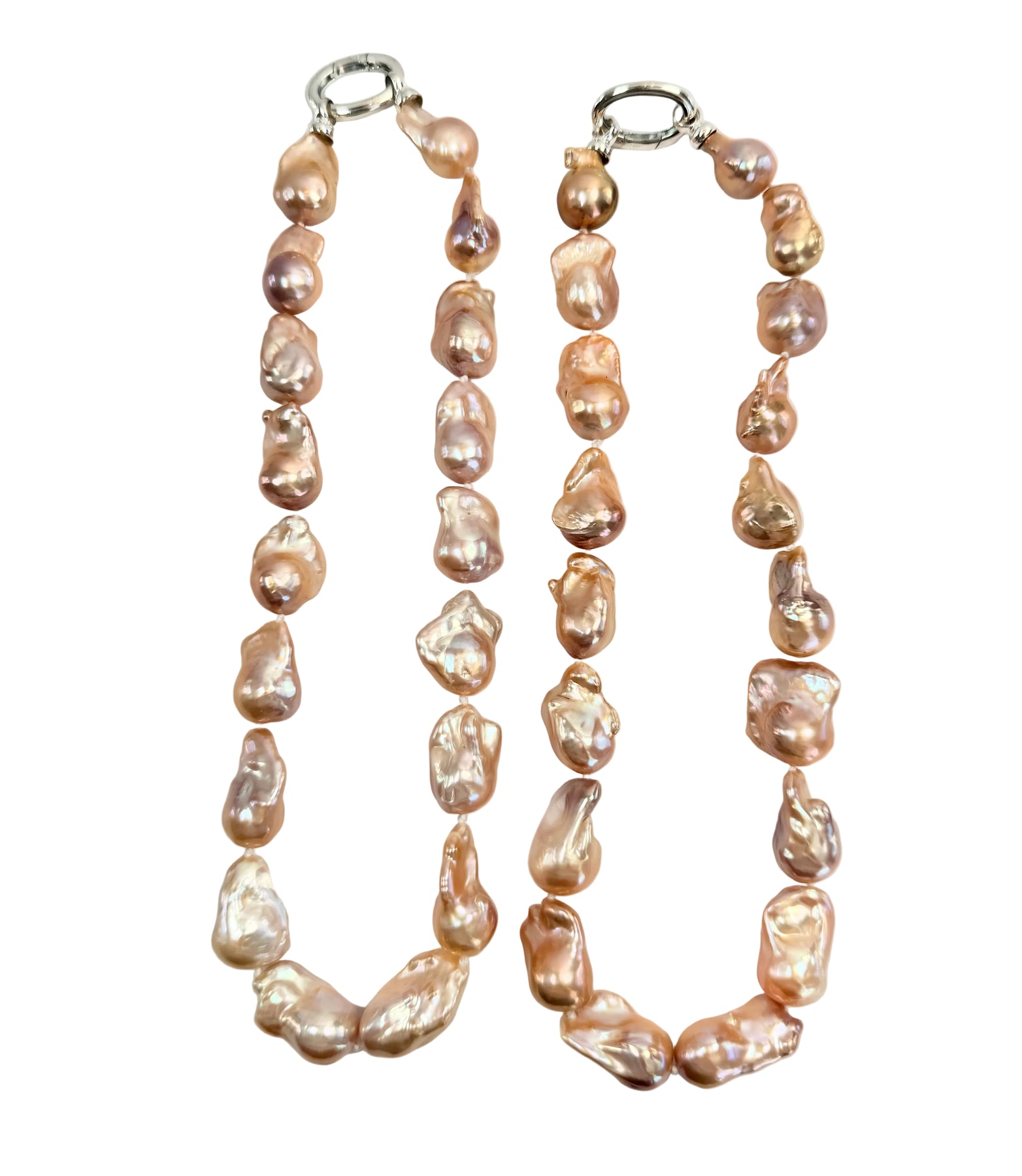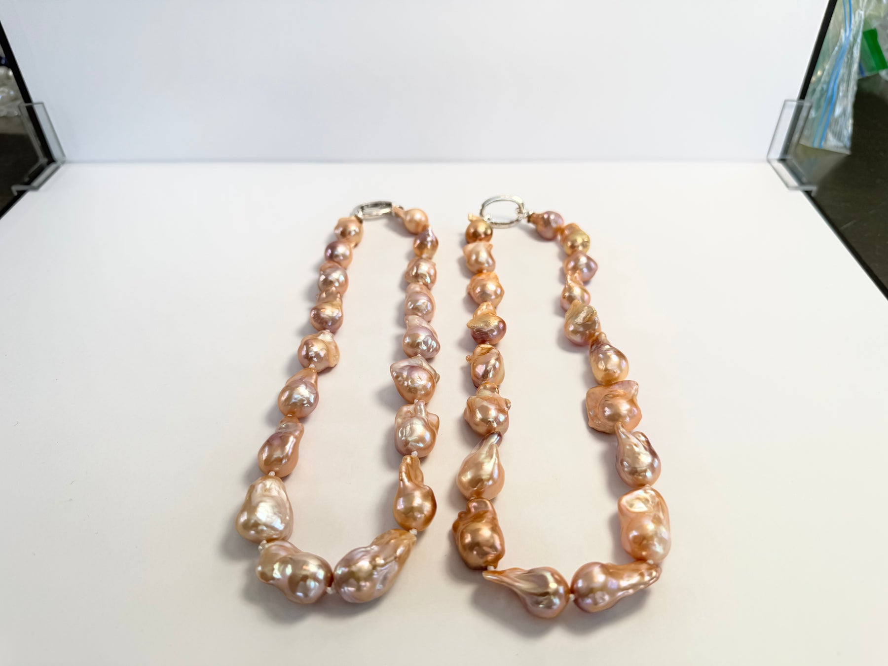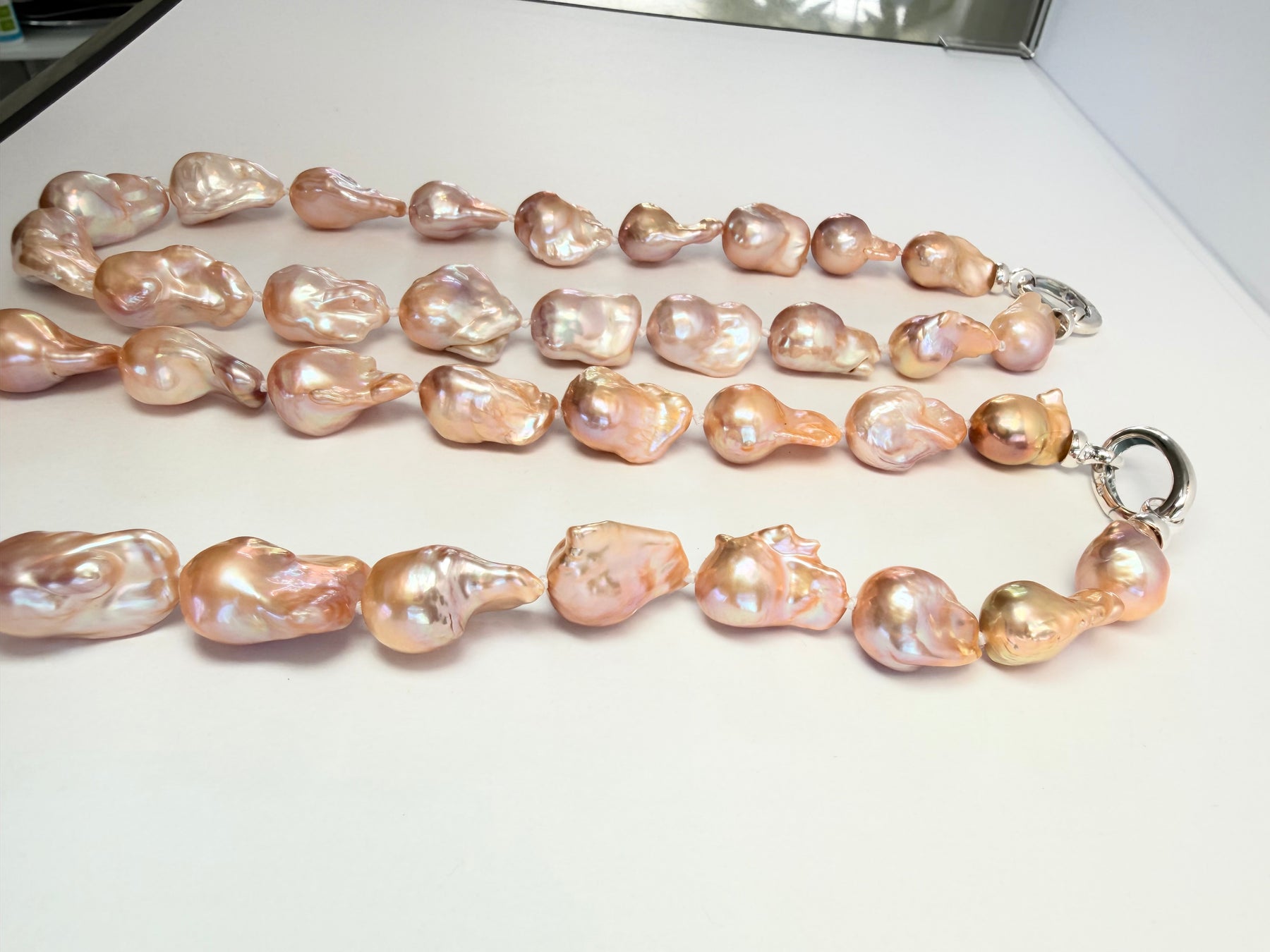 Among the most coveted pearl tones, this extraordinary strand reveals a rare interplay of gold and soft pink hues. The exceptional AAA-quality pearls display remarkable luminosity, shifting beautifully from warm gold to a delicate pink-gold as the light changes. Their generous size creates an unmistakable presence, delivering effortless impact.