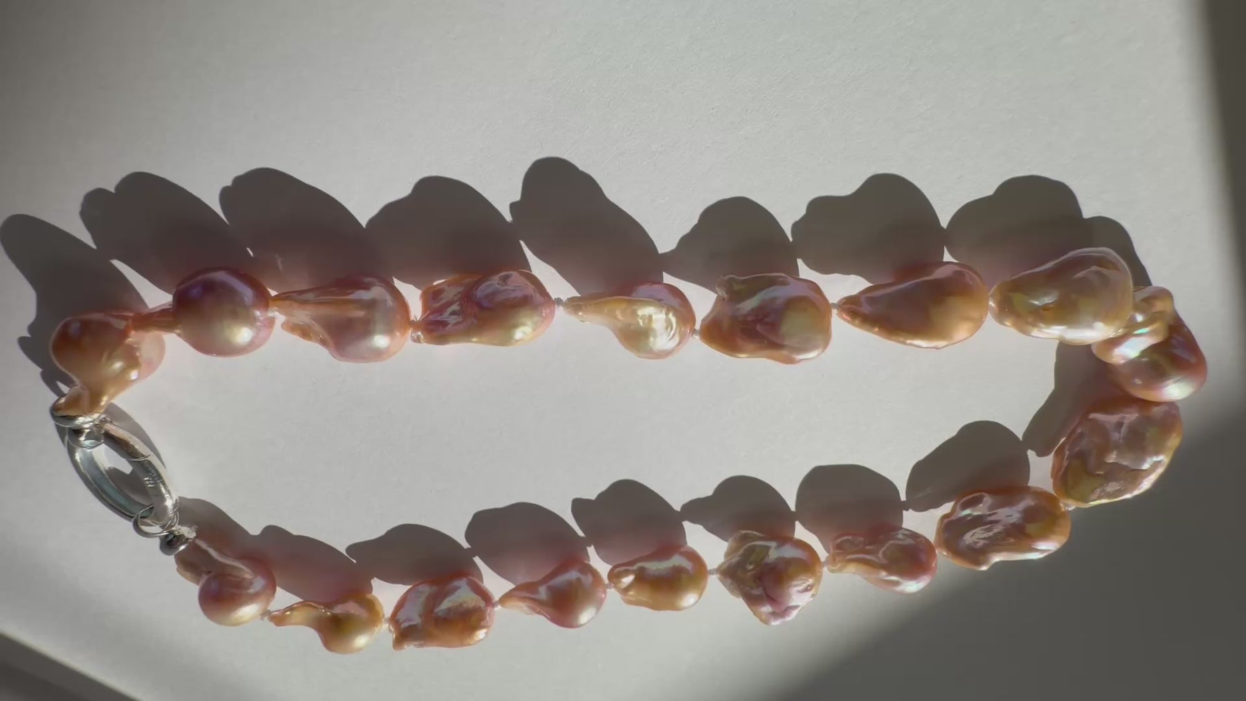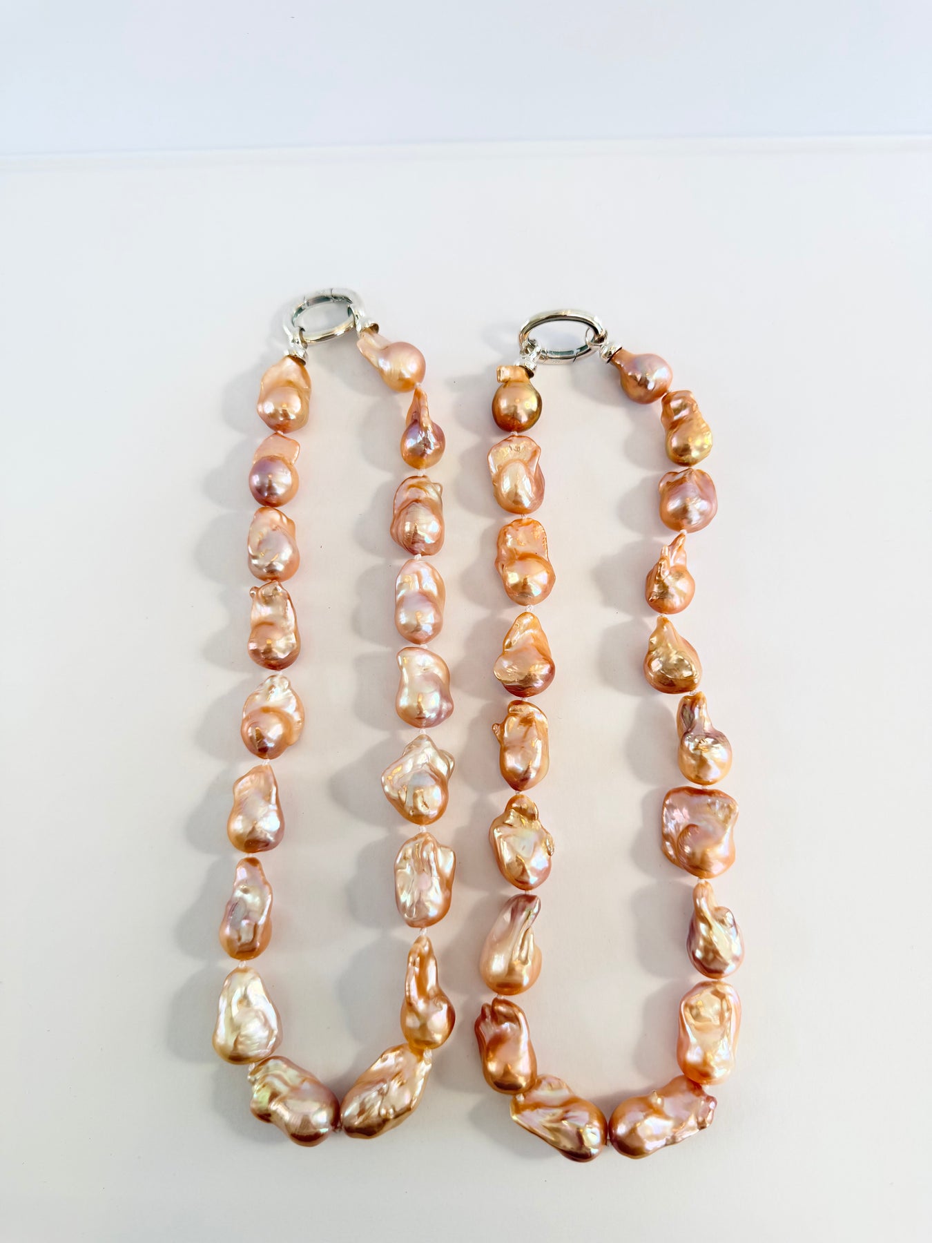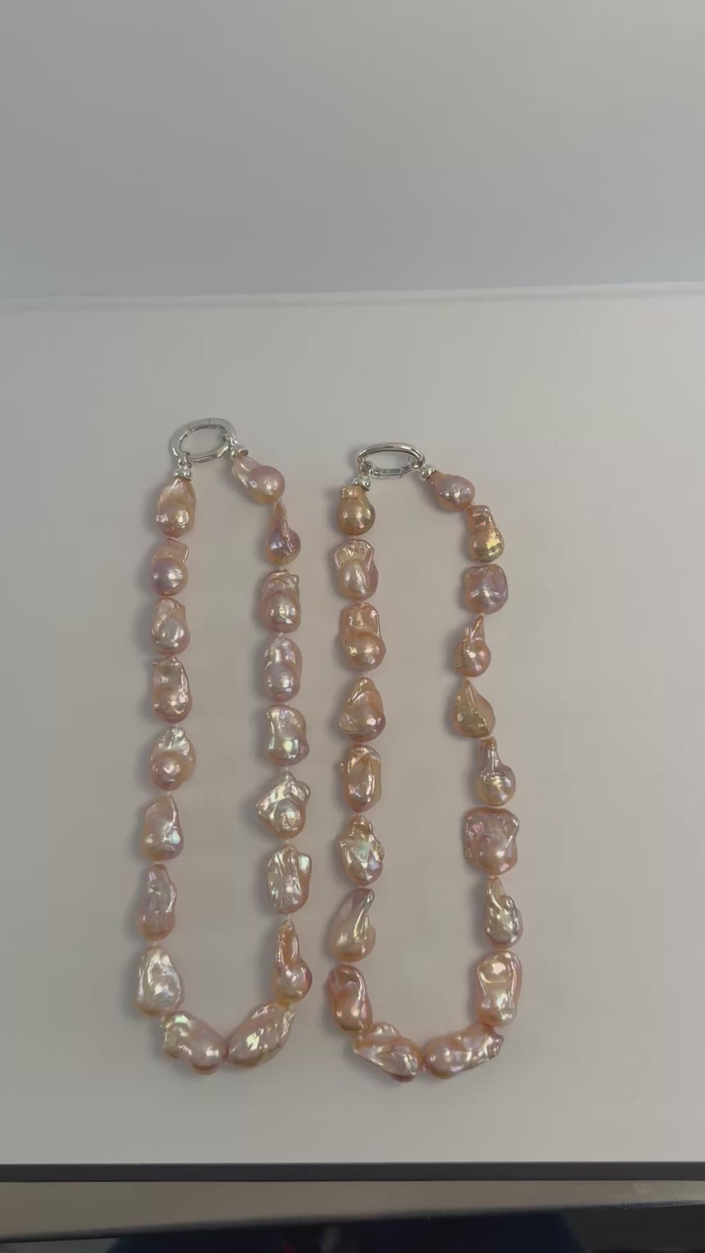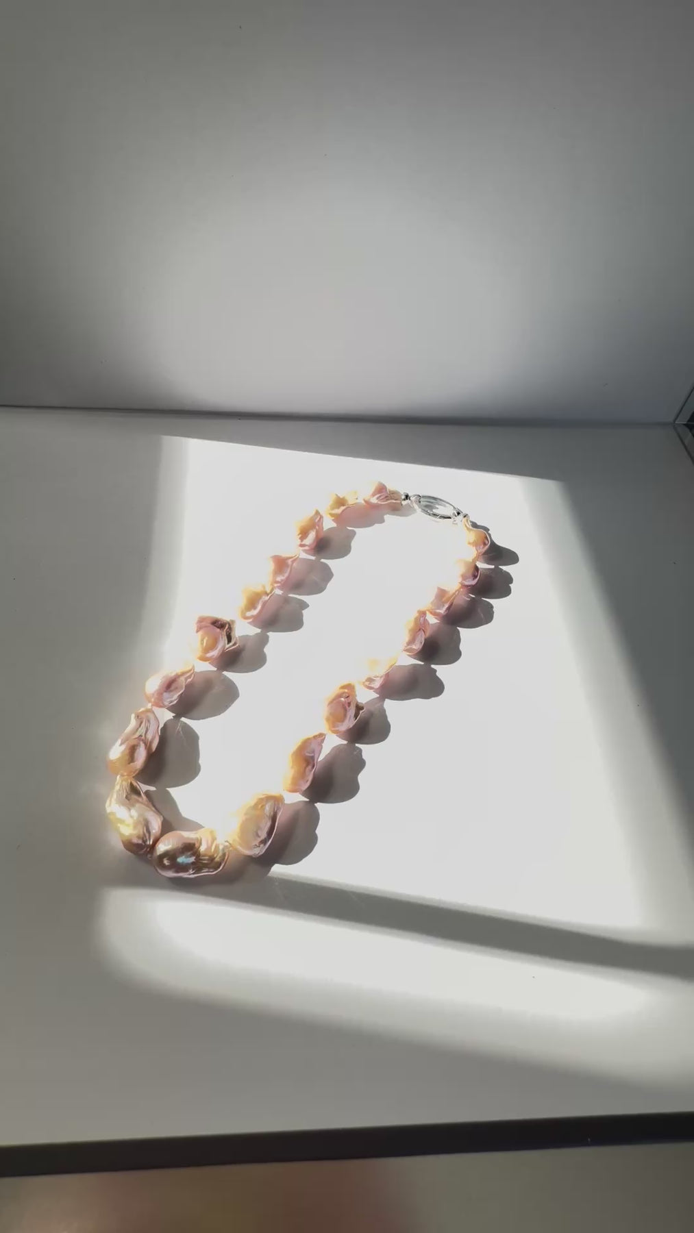 Among the most coveted pearl tones, this extraordinary strand reveals a rare interplay of gold and soft pink hues. The exceptional AAA-quality pearls display remarkable luminosity, shifting beautifully from warm gold to a delicate pink-gold as the light changes. Their generous size creates an unmistakable presence, delivering effortless impact.
