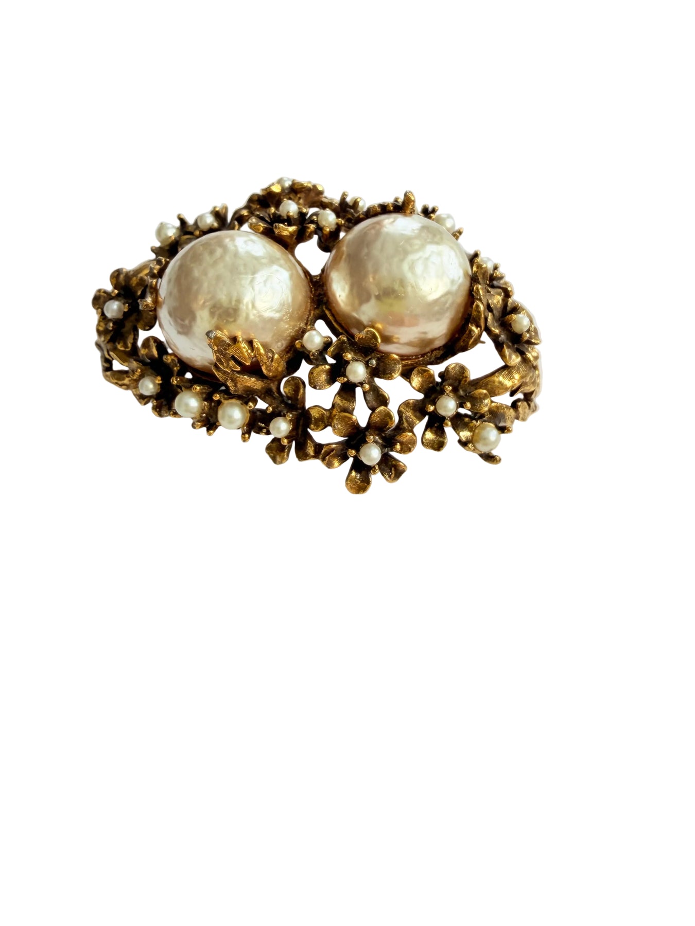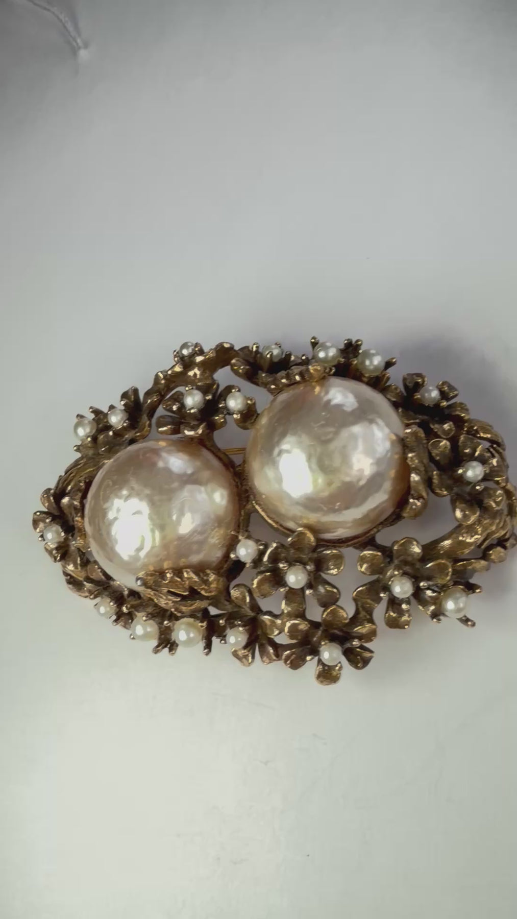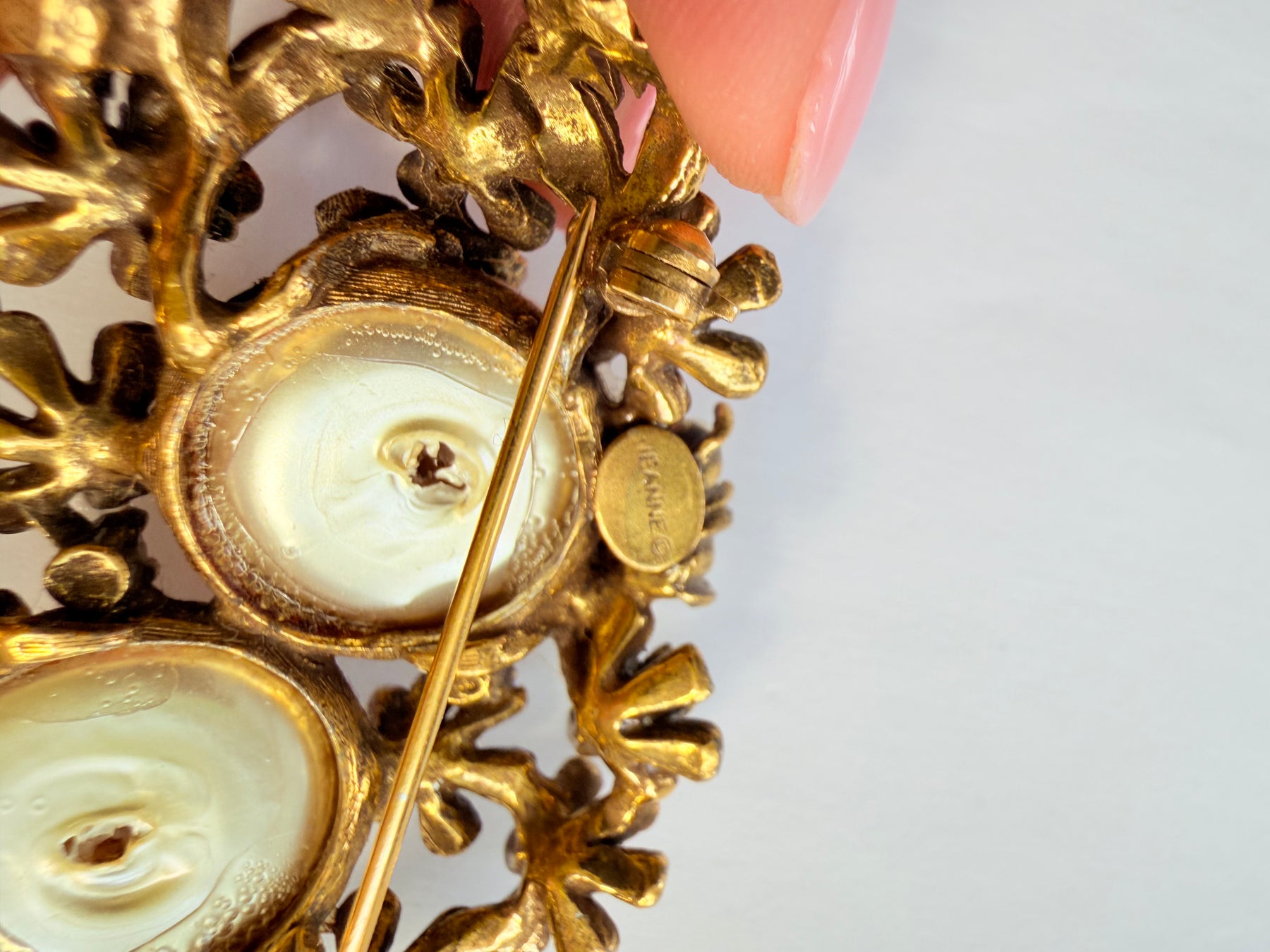 Big and bold. Perfect for a Jean Jacket. It is made by Jeanne founded by Mark Dottenheim in 1919.  The brooch is in great condition and a must have for those who like a bold statement.  There a no chips on the pearls (plastic)